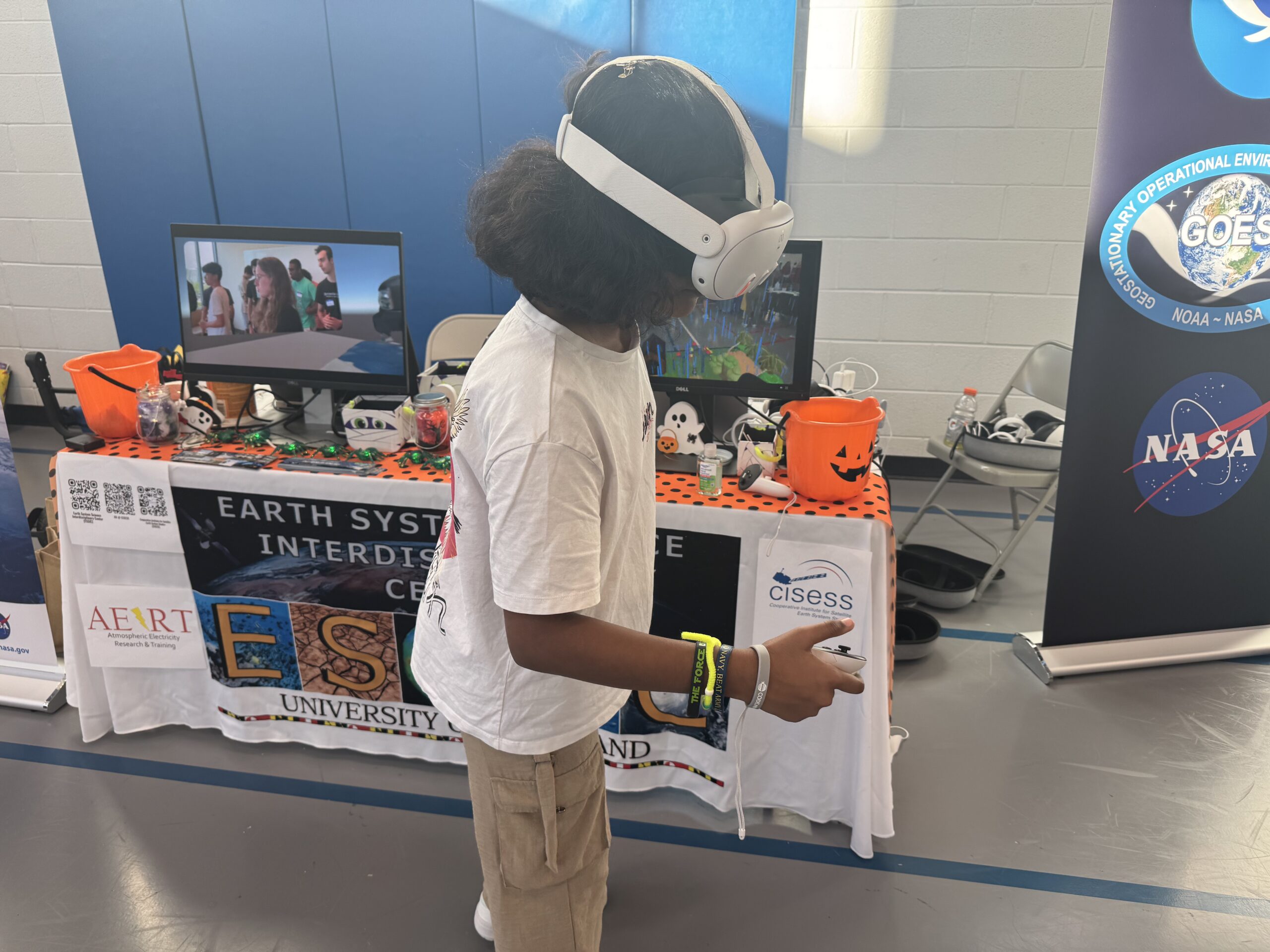 Attendees of all ages had the opportunity to “step inside” Earth System phenomena, witnessing how lightning forms and how clouds and precipitation evolve within a virtual atmosphere. The hands-on experience highlighted the use of immersive technology to make complex atmospheric science concepts more tangible and engaging.