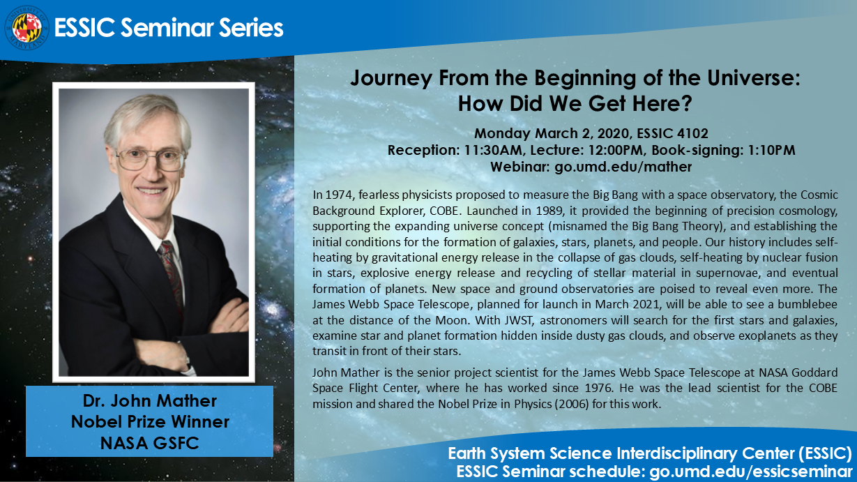 John Mather is the senior project scientist for the James Webb Space Telescope at NASA Goddard Space Flight Center, where he has worked since 1976. He was the lead scientist for the COBE mission and shared the Nobel Prize in Physics (2006) for this work.