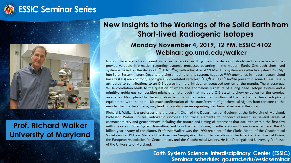Richard J. Walker is a professor and the current Chair of the Department of Geology, at the University of Maryland. He received a B.S. in geology from the College of William and Mary in Virginia. He earned both M.S. and Ph.D. degrees in geology from the State University of New York at Stony Brook. For his graduate research he studied lunar soils (M.S.), and ancient granites (Ph.D.). He did postdoctoral work at the U.S. National Bureau of Standards, the Carnegie Institution of Washington’s Department of Terrestrial Magnetism, and the U. S. Geological Survey. He joined the faculty of the University of Maryland in 1990. Professor Walker utilizes radiogenic isotopes and trace elements to conduct research in several areas of cosmochemistry and geochemistry, including the nature and timing of processes that occurred within the first few million years of Solar System formation, and how the Earth’s core, mantle and crust have interacted over the 4.5 billion year history of the planet.