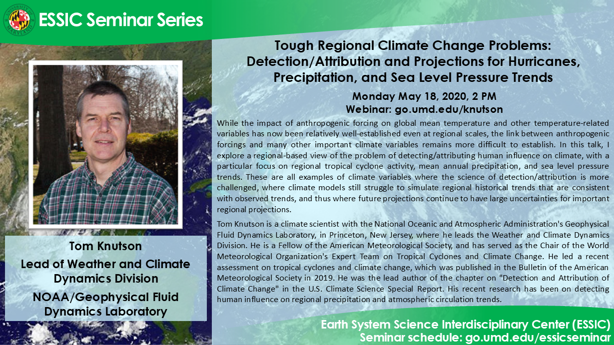 Tom Knutson is a climate scientist with the National Oceanic and Atmospheric Administration’s Geophysical Fluid Dynamics Laboratory, in Princeton, New Jersey, where he leads the Weather and Climate Dynamics Division. He is a Fellow of the American Meteorological Society, and has served as the Chair of the World Meteorological Organization’s Expert Team on Tropical Cyclones and Climate Change. He led a recent assessment on tropical cyclones and climate change, which was published in the Bulletin of the American Meteorological Society in 2019. He was the lead author of the chapter on “Detection and Attribution of Climate Change” in the U.S. Climate Science Special Report. His recent research has been on detecting human influence on regional precipitation and atmospheric circulation trends.