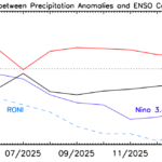 As we likely move from La Nina to an El Nino mode over the next few months the ocean temperature in the tropics will increase and the precipitation pattern will change and likely produce a positive total ocean precipitation anomaly, reversing the current La Nina situation. While the current global surface temperature signal is above its long-term trend line even during the recent and current La Nina (an unusual feature in the long-term record) (see Fig. 3), it is likely that the surface temperature will increase even further if the planet goes into an El Nino and the global precipitation anomaly will go from the recent global negative anomaly to be on the positive side. If indeed the forecast El Nino comes to fruition, it will be interesting to follow the large-scale precipitation evolution.