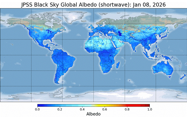 For the albedo products, Jingjing Peng and Peng Yu work on the GOES ABI Albedo product and Jingjing and Zhen Song on the JPSS VIIRS Albedo product. Jingjing and Zhen are developing a new VIIRS Bidirectional Reflectance Distribution Function (BRDF), measuring the earth’s reflectivity with solar and viewing geometry. From BRDF, two types of surface albedo are derived: black-sky albedo (BSA), representing albedo under direct solar illumination, and white-sky albedo (WSA), representing albedo under fully diffuse illumination. The product also provides nadir BRDF-adjusted reflectance (NBAR), which normalizes surface reflectance to a standard viewing geometry—local solar noon in this product. Jingjing is also working on incorporating the upcoming METOP-SG METimage data into albedo and BRDF products. In addition, there is a Surface Reflectance product from JPSS VIIRS maintained by Yuan Zhou.
