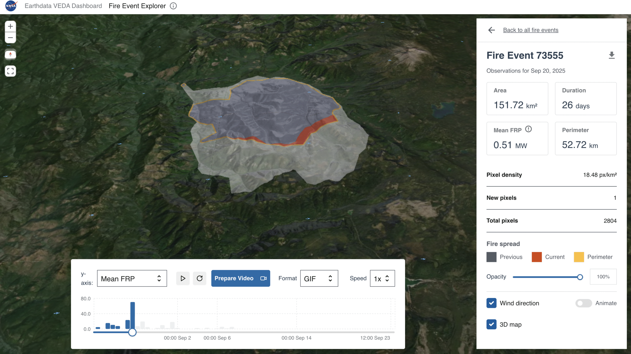 Recently, the team collaborated with NASA’s Visualization, Exploration, and Data Analysis (VEDA) to create the Fire Event Explorer, an interactive tool that lets users visualize and animate the growth of individual fires without any programming experience. With these layers, users can view active fire perimeters from the beginning of the calendar year up to the present day, as well as save an animation showing a fire’s growth over time.